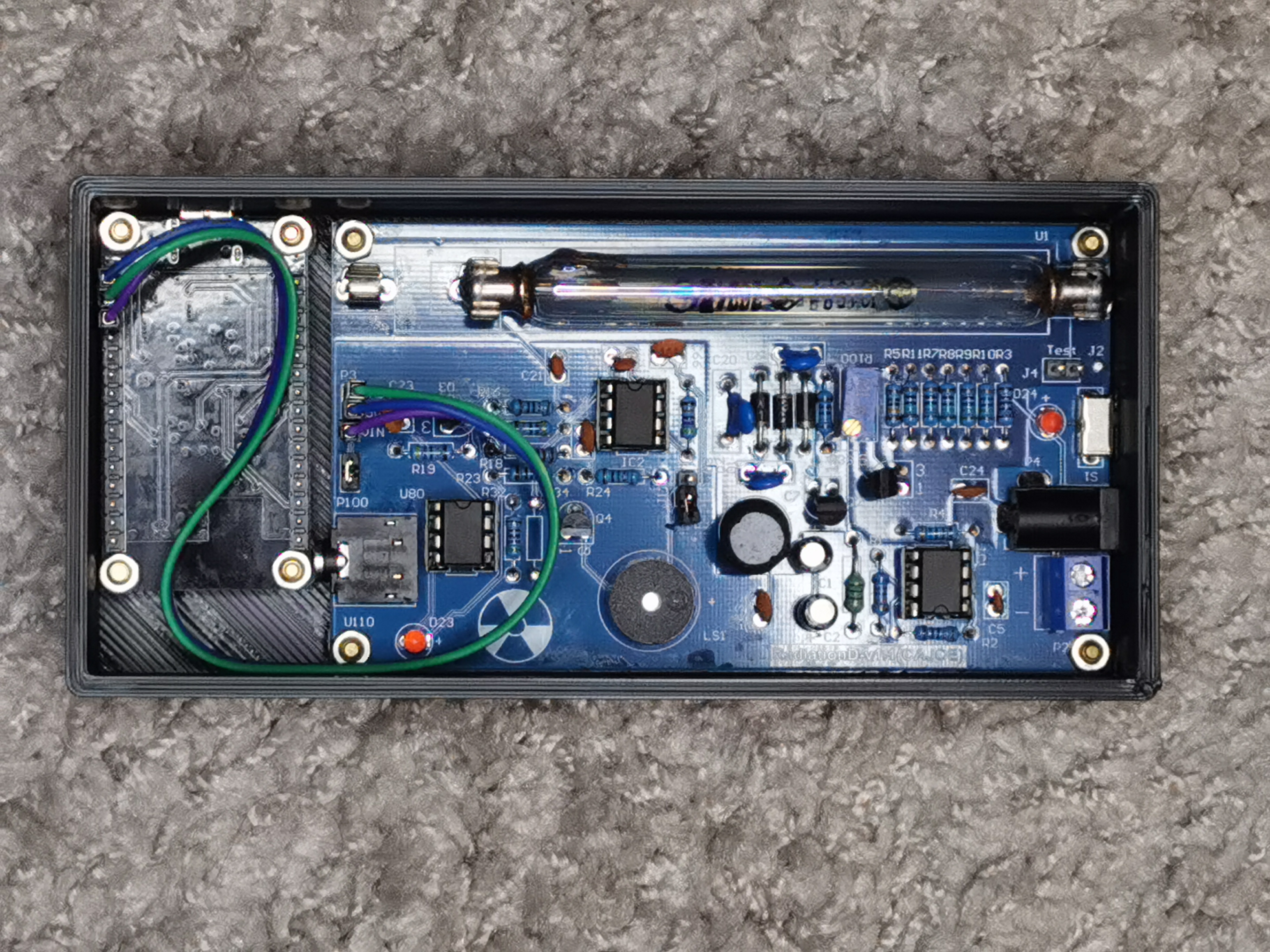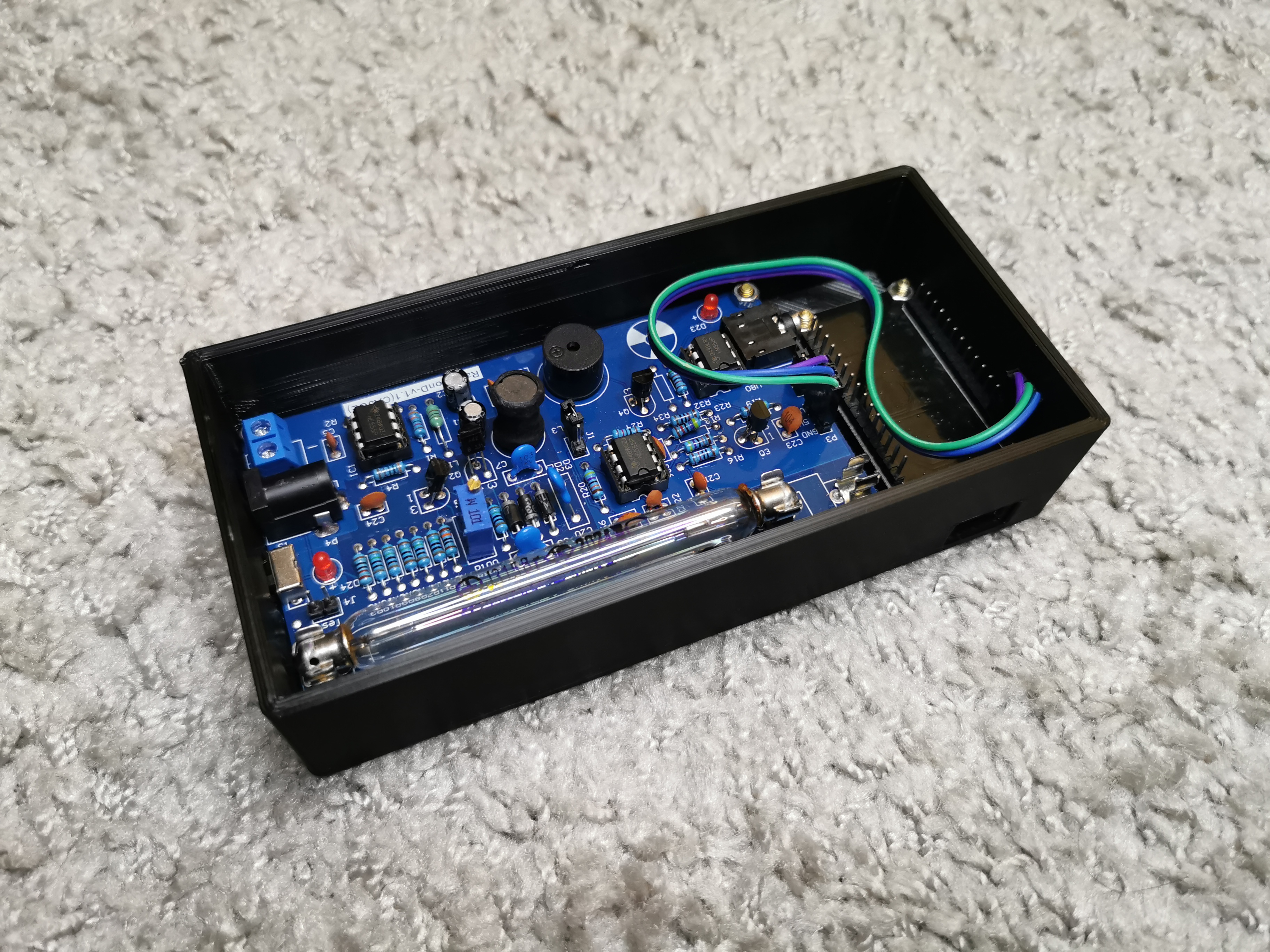 Files download here https://git.noop.re/drops/Geiger-interface/src/branch/main/stl - case_bottom_oled.stl have more height due a gold pins on oled display and esp32 board. If you have / order boards without gold pins and you use soldering wires to connect, you can print standard case.